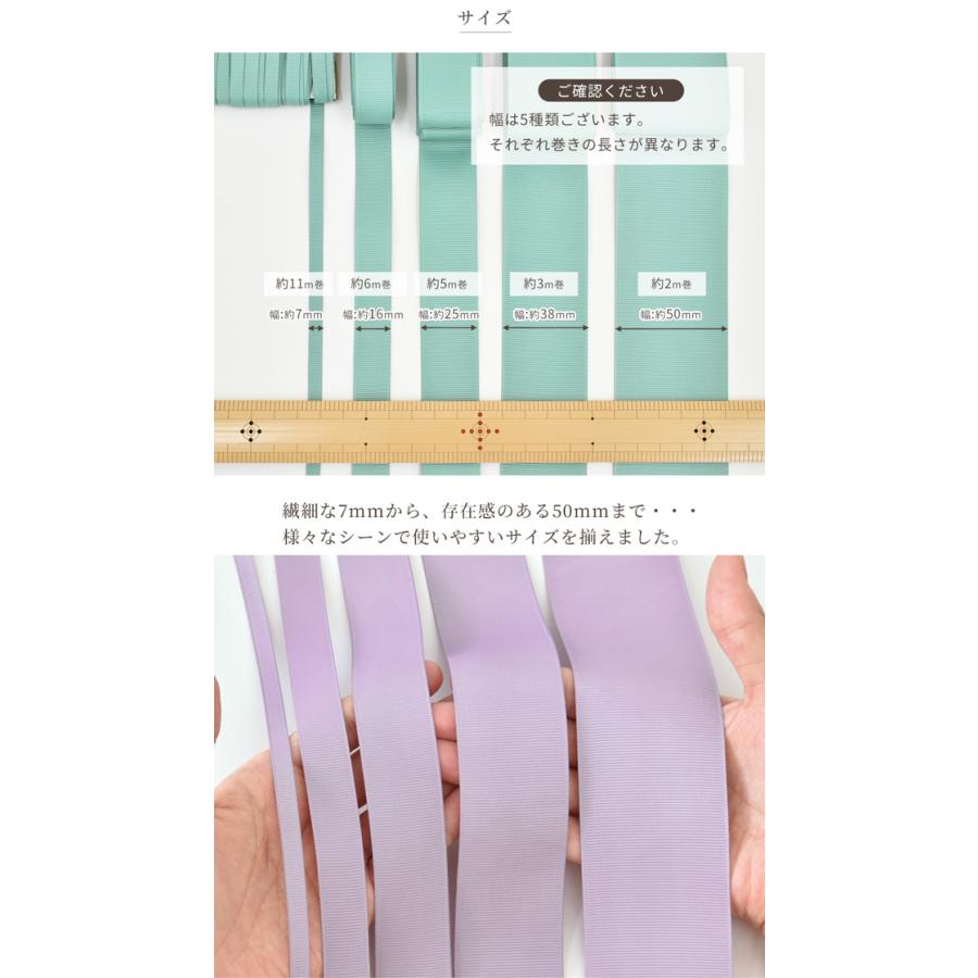 #ゆうパケ7mm 16点、16mm 20点、25mm 28点、38mm 30点、50mm 36点可グログランリボン7mm・16mm・25mm・38mm・50mm幅思わずうっとりしてしまう、上品なくすみカラーを厳選しました!お色は全部で8色です。フォーマルなアクセサリーや、ナチュラルなお洋服にも合わせやすく、繊細なうねと光沢が、よりいっそうエレガントに魅せます。幅も5種類ありますので、異なる幅のリボンを組み合わせても素敵な作品に仕上がります。