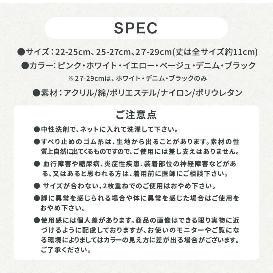 ●サイズ/丈約(cm): 22-25cm(丈約11cm) 25-27cm(丈約11cm) 27-29cm(丈約11cm)●カラー:ピンク・ホワイト・イエロー・ベージュ・デニム・ブラック※27-29cmはホワイト・デニム・ブラックのみ●素材:アクリル・綿・ポリエステル・ナイロン・ポリウレタン●意匠登録 第1377135号●平成30年度(公社)発明協会 会長賞 受賞
