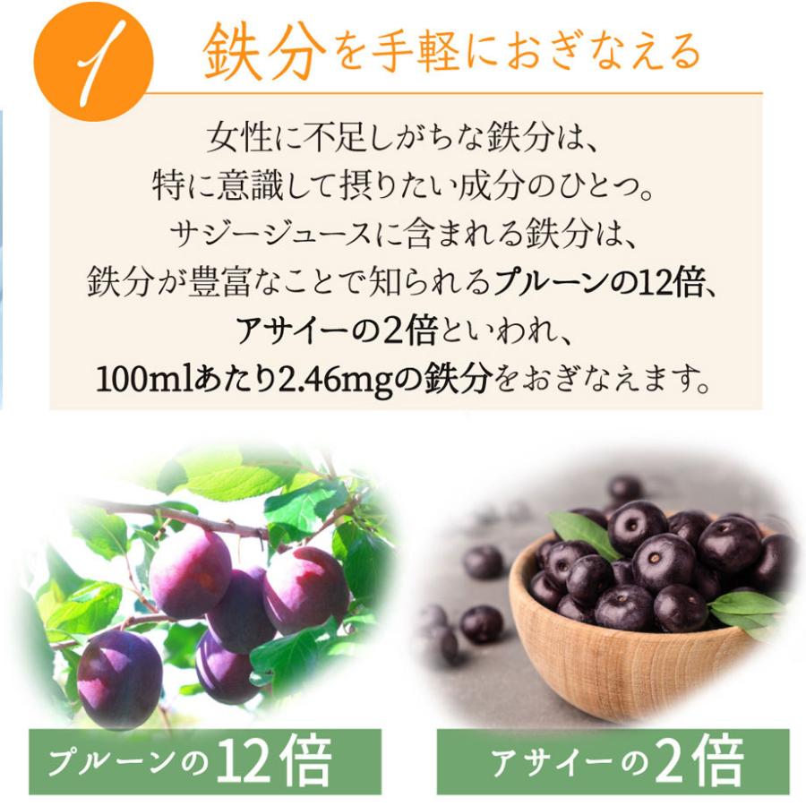 サジージュースは鉄分が豊富なことで知られるプルーンの12倍、アサイーの2倍といわれ、