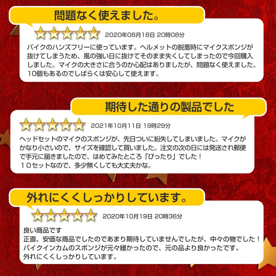 ヘッドセットやピンマイク、インカムなどの小型マイク用のスポンジ10セットです。マイク部分の保護やホコリなどの侵入の防止に風や呼吸音などの雑音の軽減に役立ちます。消耗品ですが10個セットなので安心です。【サイズ】 30mm×20mm×穴径8mm伸縮性があるので直径13mm程度までのマイクにお使い頂けます。【発送方法】 全国送料無料 定形外郵便にて発送いたします。【安心の30日保証】 購入後、30日以内でしたら交換返金対応いたします。