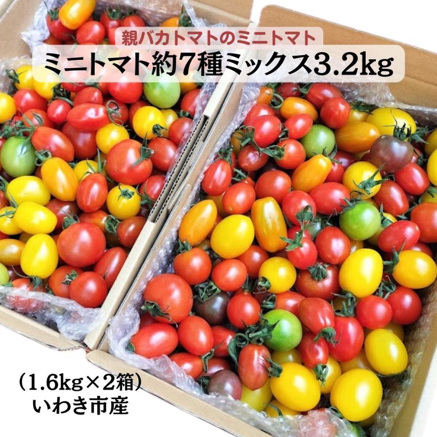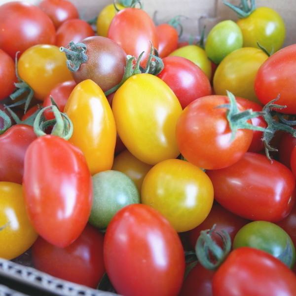 赤3〜4種,黄2種と緑,紫,オレンジ各1種の色とりどりのミニトマトが3.2kg入った詰め合わせ