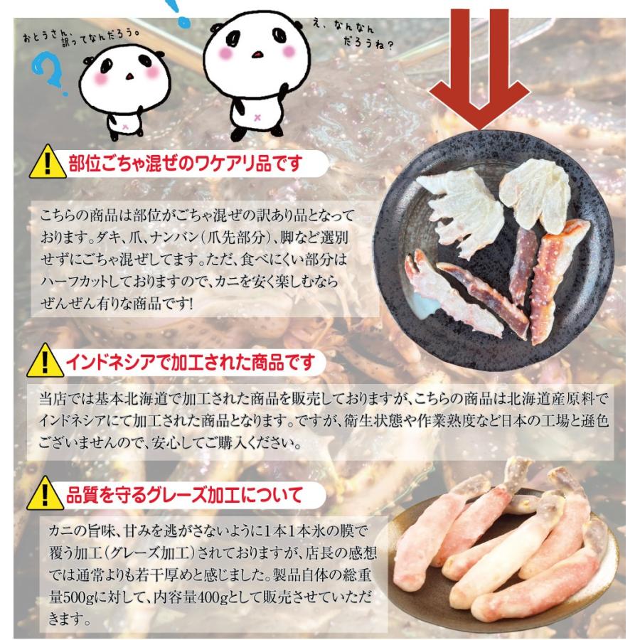 北海道根室産の本たらば蟹がワケアリ超特価。ごちゃまぜの訳あり品で、インドネシア加工品のため激安です!【内容量】総重量500g(内容量400g)【発送区分】冷凍発送限定【原料産地】北海道根室市【加工地】インドネシア【訳あり,わけあり,限定,激安,訳アリ,ワケあり,訳あり商品,ワケアリ,訳有,ワケ有,わけ有,業務用,お試し】
