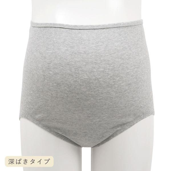 ウエスト丈は大きなお腹もすっぽり包む安心感のある深履きタイプ。股部分はおりものの変化が分かりやすい白地綿素材を使用しています。