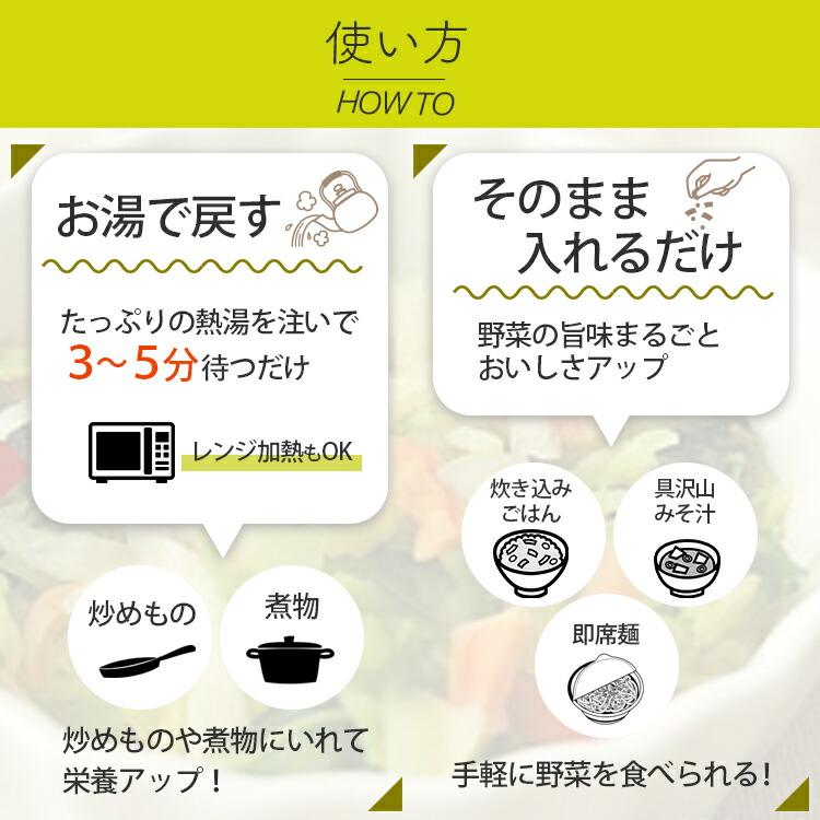 ■内容量:300g ■原材料:キャベツ(国産)、ほうれん草(国産)、にんじん(国産)、ブドウ糖(乾燥野菜の割れや欠け防止、戻しやすくする為に使用)■保存方法:高温多湿、直射日光を避けて冷暗所で保存して下さい ■アレルギー:当工場では、小麦、そば、卵、乳成分、落花生、えび、かにを含む製品を製造しています ■賞味期限:2026年12月以降