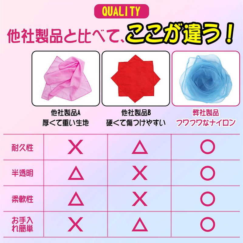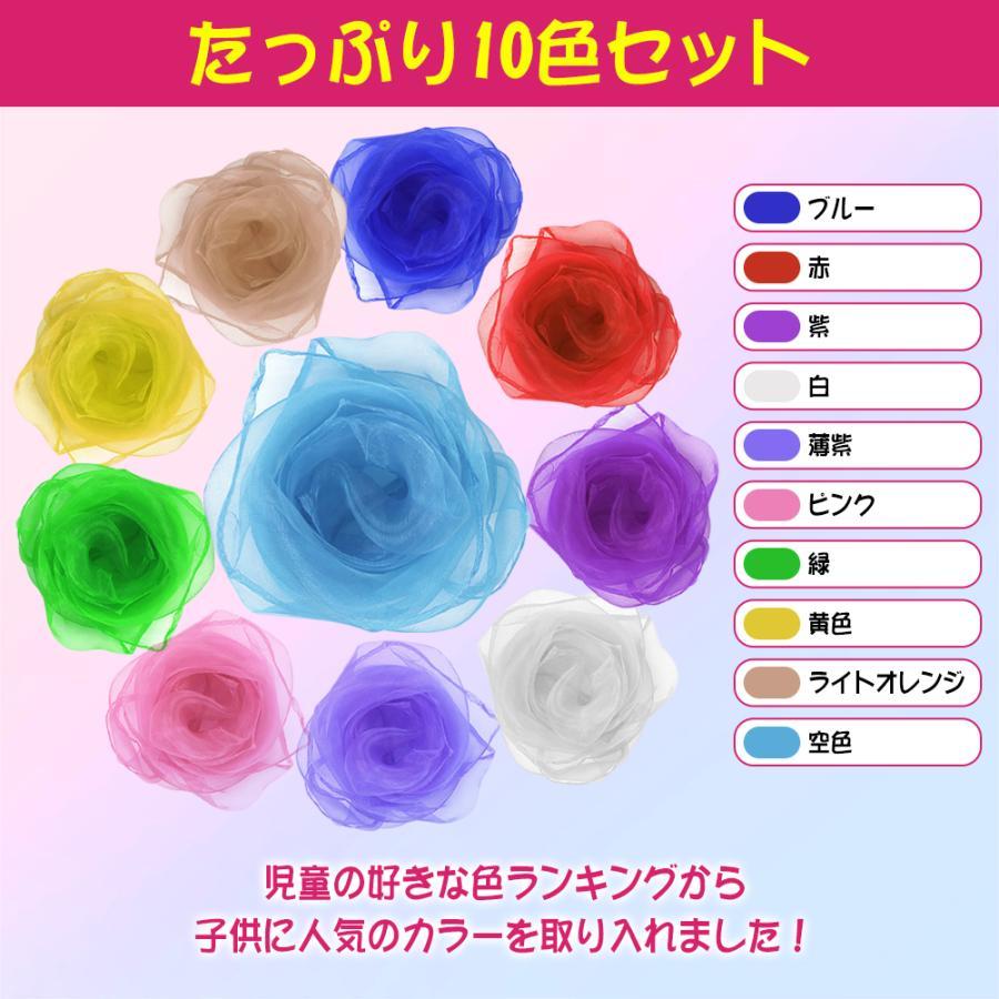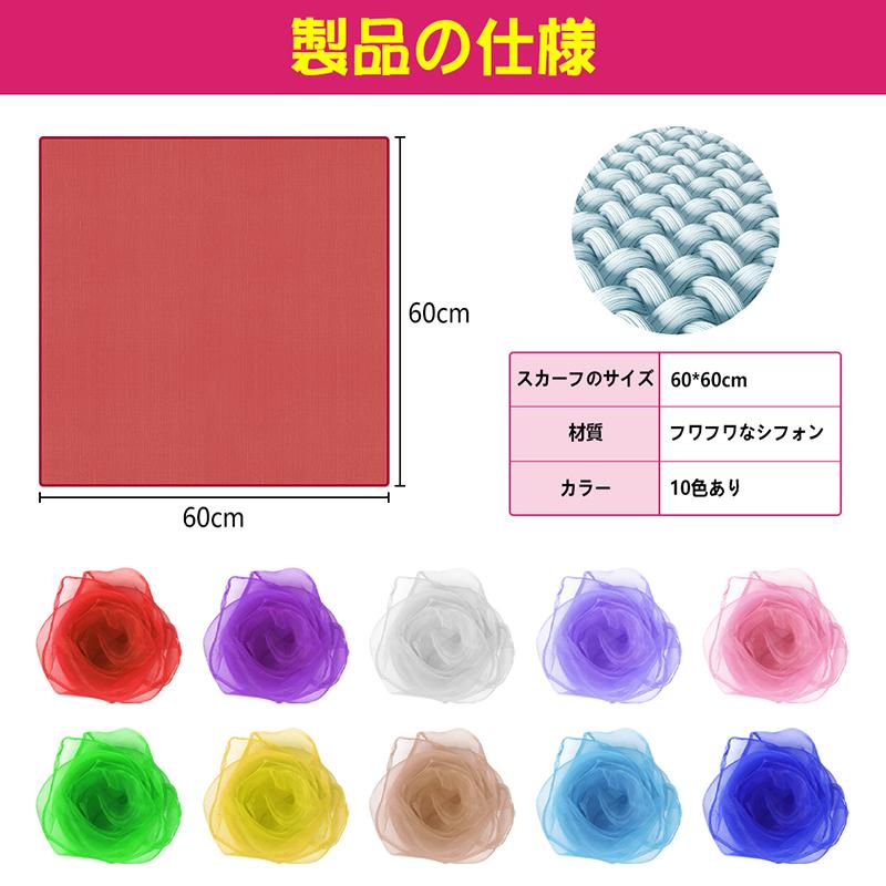 ■商品名:リトミックスカーフ■色:10色カラー■内容量:各色1枚 合計10枚■材質:シフォン生地■サイズ:60×60cm関連キーワード:音楽療法 リハビリ 介護 リトミックスカーフ リトミック スカーフ 道具 用品 大判 楽器玩具 知育 教材 音楽 ダンス 10色セット 10枚 ポンチョ レディース こども 子供 体操 リズム