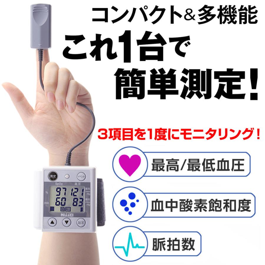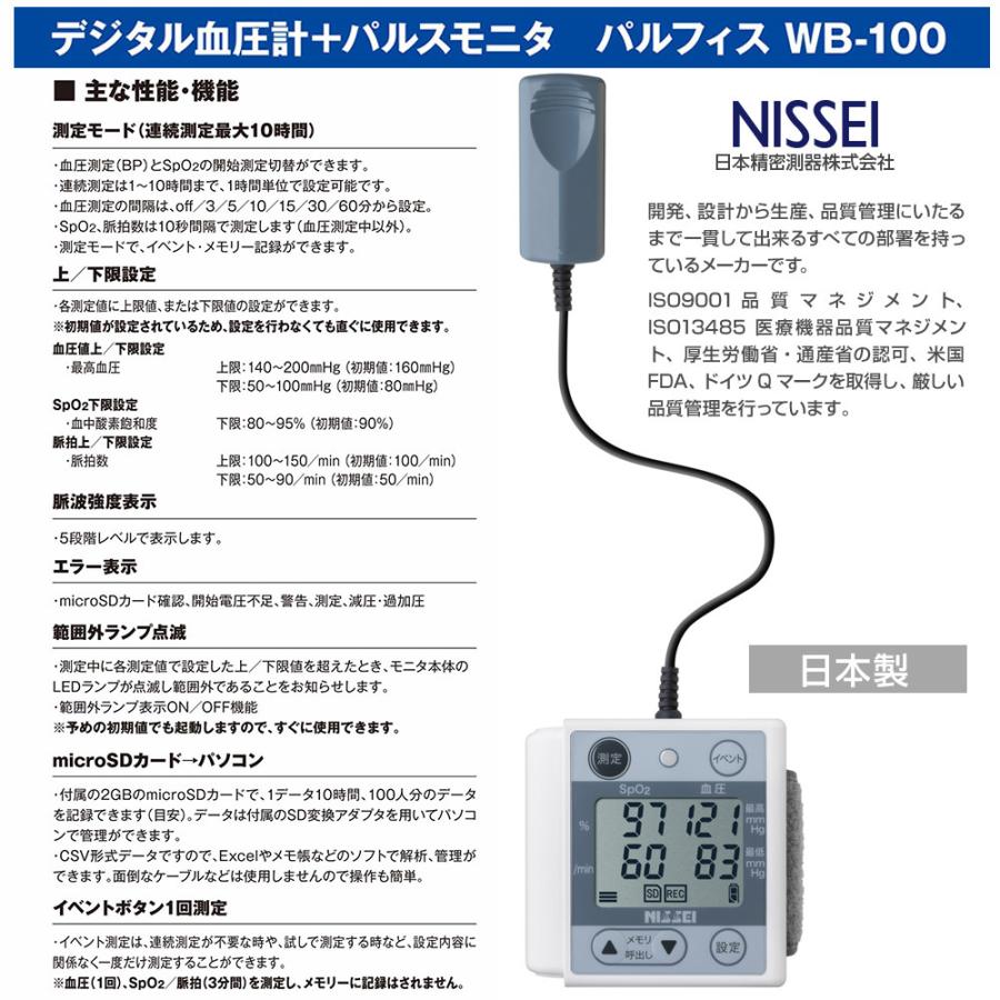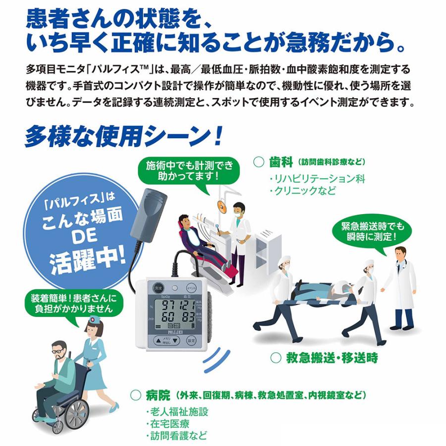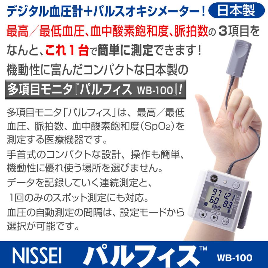 デジタル血圧計+パルスオキシメーター!最高/最低血圧、血中酸素飽和度、脈拍数の3項目をこれ1台で簡単測定!機動性に富んだコンパクトな日本製の多項目モニタ『パルフィス WB-100』!多項目モニタ「パルフィス」は、最高/最低血圧、脈拍数、血中酸素飽和度(SpO2)を測定する医療機器です。手首式のコンパクトな設計で、操作も簡単、機動性に優れ使う場所を選びません。データを記録していく連続測定と、1回のみのスポット測定にも対応。血圧の自動測定の間隔は、設定モードから選択が可能です。