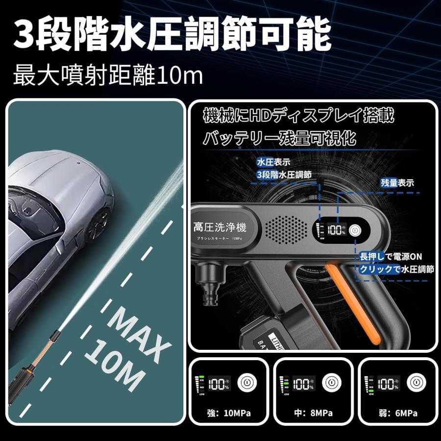 【商品仕様】◆商品名称:5in1 高圧洗浄機◆最大吐出圧力:約10.0Mpa◆最大吐出水量:約8.0L/min◆使用温度範囲:0~40°C◆質量:約2.0kg◆パワーモード:3段階切り替え◆給水方式:自動吸水式(5m専用高圧ホース)◆梱包内容:高圧洗浄機本体、バッテリー、充電アダプター、回転加圧5in-1ノズル、フォームノズル、フィルターです、クイックコネクター、ボルト用ホースー、ホース(5m)、収納ケースー、説明書です