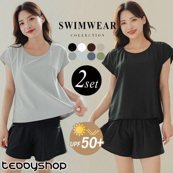 UVカット率 99%以上 水着 レディース 体型カバー水着 UPF50+ ママ水着 セパレート 大きいサイズ レイヤード風 半袖ラッシュガードセット ショートパンツ 2点セット 黒 白 かわいい 服みたいな 30代 40代 50代 60代 ミセス 大人 ウエスト ヒップ 太もも カバーアップ