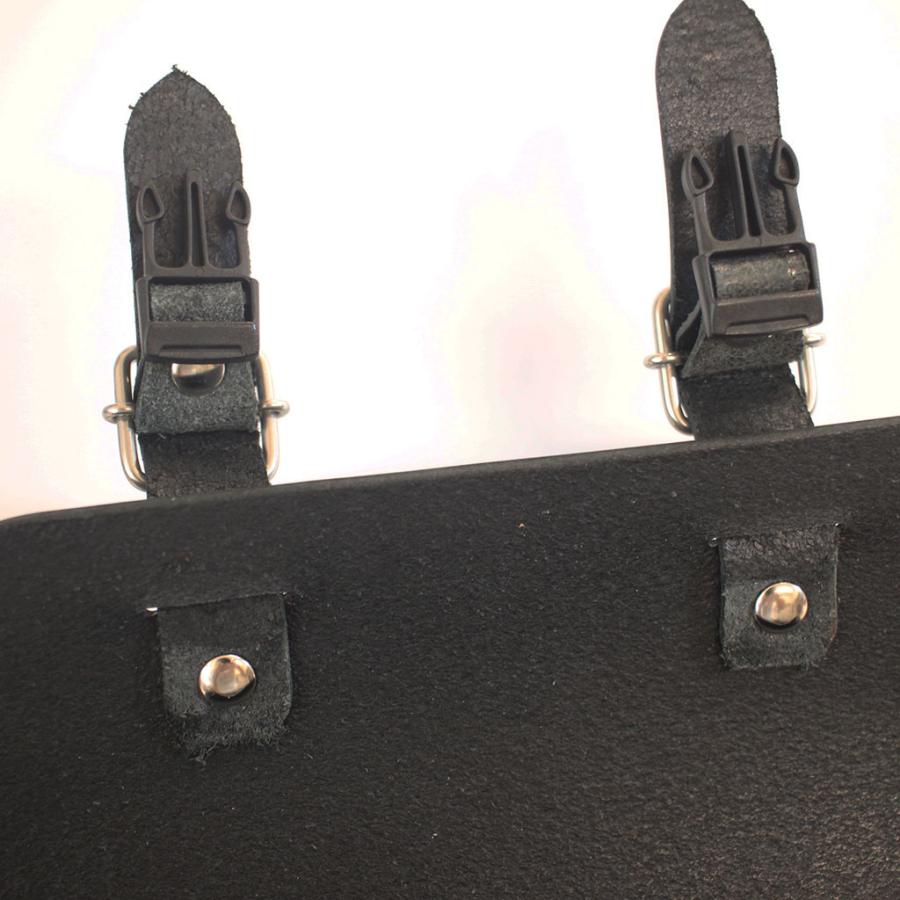 フタ部分は2本ベルトタイプ、金具の下に開閉しやすい樹脂製ワンタッチバックルを備えています。