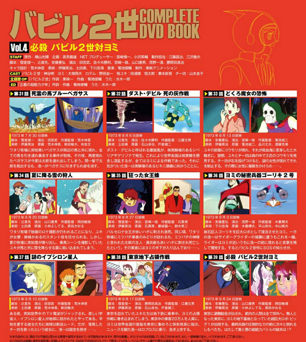 昭和を代表する名作アニメ「バビル2世」全39話を計4巻に分けたDVD BOOKが大好評刊行中!キャラクターデザインを務めた故・荒木伸吾の盟友・姫野美智のインタビュー&描きおろしイラスト収録の最終巻第4巻がいよいよ6月3日に発売!昭和の人気アニメがお手頃価格の分冊シリーズでよみがえる『COMPLETE DVD BOOK』シリーズ。その最新ラインナップとして、70年代を代表するTVアニメシリーズ『バビル2世』全39話を4巻に分けて収録する廉価版DVD BOOKシリーズが、2025年3月4日より月1回ペースで刊行中です。本作は1971年に『週刊少年チャンピオン』でスタートした、生誕90周年を迎えた横山光輝氏による超能力バトル漫画の先駆け的作品。連載後すぐに人気を博し1973年には早くもテレビアニメ化され、正義の超能力少年バビル2世が“3つのしもべ”ロプロス、ポセイドン、ロデムを従え、悪の超能力者ヨミの陰謀を粉砕すべく戦いを繰り広げるストーリーは、当時の子供たちの心を鷲掴みにしました。また、水木一郎が唄う主題歌も大ヒットし、90年代に入ってからはオリジナルビデオアニメ化、2001年には再TVアニメ化されるなど、50年以上にわたってファンを魅了し続けている作品となっています。DVDは9〜10話分約3時間半〜4時間を収録し、16Pの保存版ブックレットでは各話ストーリー解説やチェックポイントを紹介。最終巻となる今回のvol.4では、キャラクターデザインを務めた荒木伸吾とのコンビで数々の名作を手掛けた姫野美智のインタビューと描きおろしイラストを掲載。他にも設定画やセル画ギャラリーなど、マニア垂涎の内容となっており、一度は観ておきたい名作アニメのDVDと、その魅力を解説したブックレットをセットでお届けします。◆超能力者同士のバトルを描いたエポックメイキングな作品◆荒木伸吾キャラクターデザインによる“美形キャラ”は女性ファンも魅了◆水木一郎が熱唱する主題歌は昭和アニソンの代名詞的な曲に◆2024年から2025年にかけては横山光輝先生の生誕90周年イヤー<vol.4 DVD内容> ※約4時間第31話 死霊の馬ブルーペガサス第32話 ダスト・デビル 死の灰作戦第33話 どくろ魔女の恐怖第34話 夏に降る雪の狩人第35話 狂った女王蜂第36話 ヨミの秘密兵器ゴーリキ2号第37話 謎のイプシロン星人第38話 東京地下占領作戦第39話 必殺 バビル2世対ヨミ<vol.4ブックレット内容>・TVシリーズ第31〜39話のストーリーや見どころをCHECK!・ロデム設定画・サブキャラクター&メカニック設定画紹介・姫野美智(アニメーター・イラストレーター)インタビュー・氷川竜介コラム「砂の嵐に隠された伝説」・セル画セレクション・ギャラリー(c)光プロ・東映アニメーション更新日:2025年04月28日