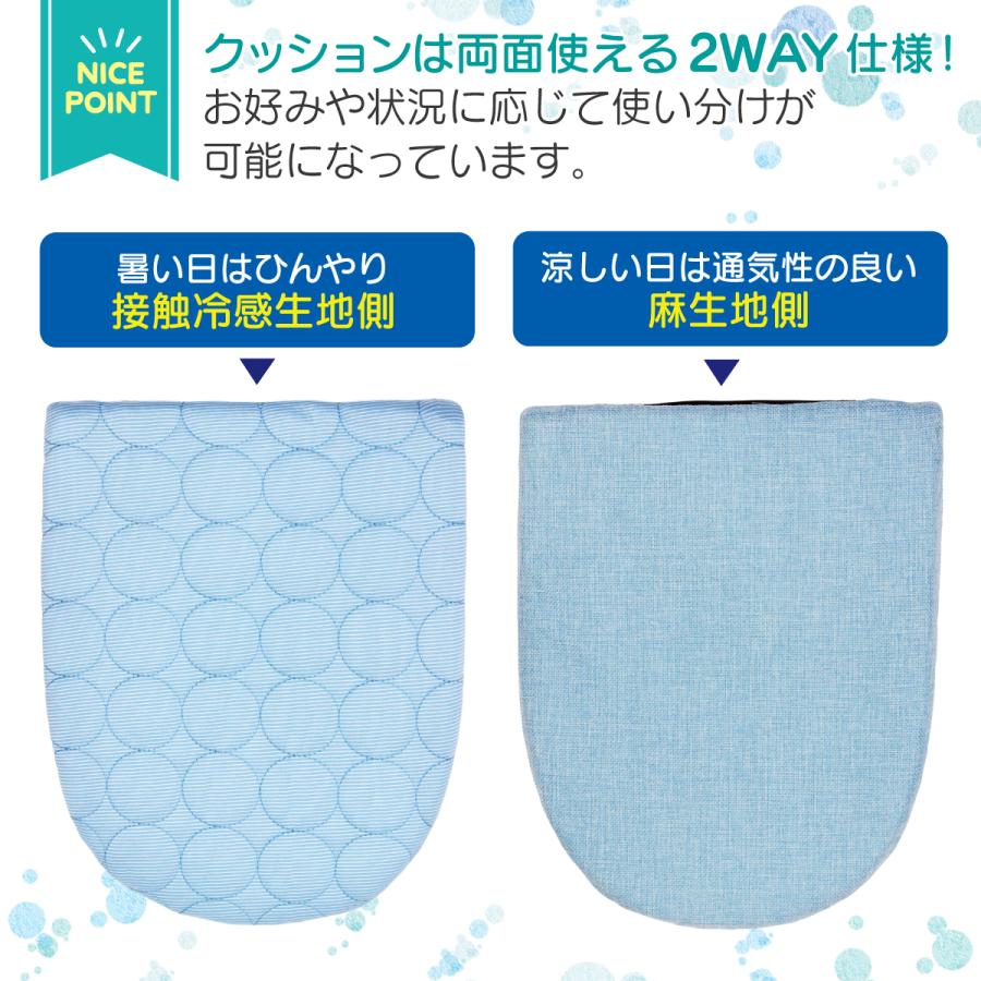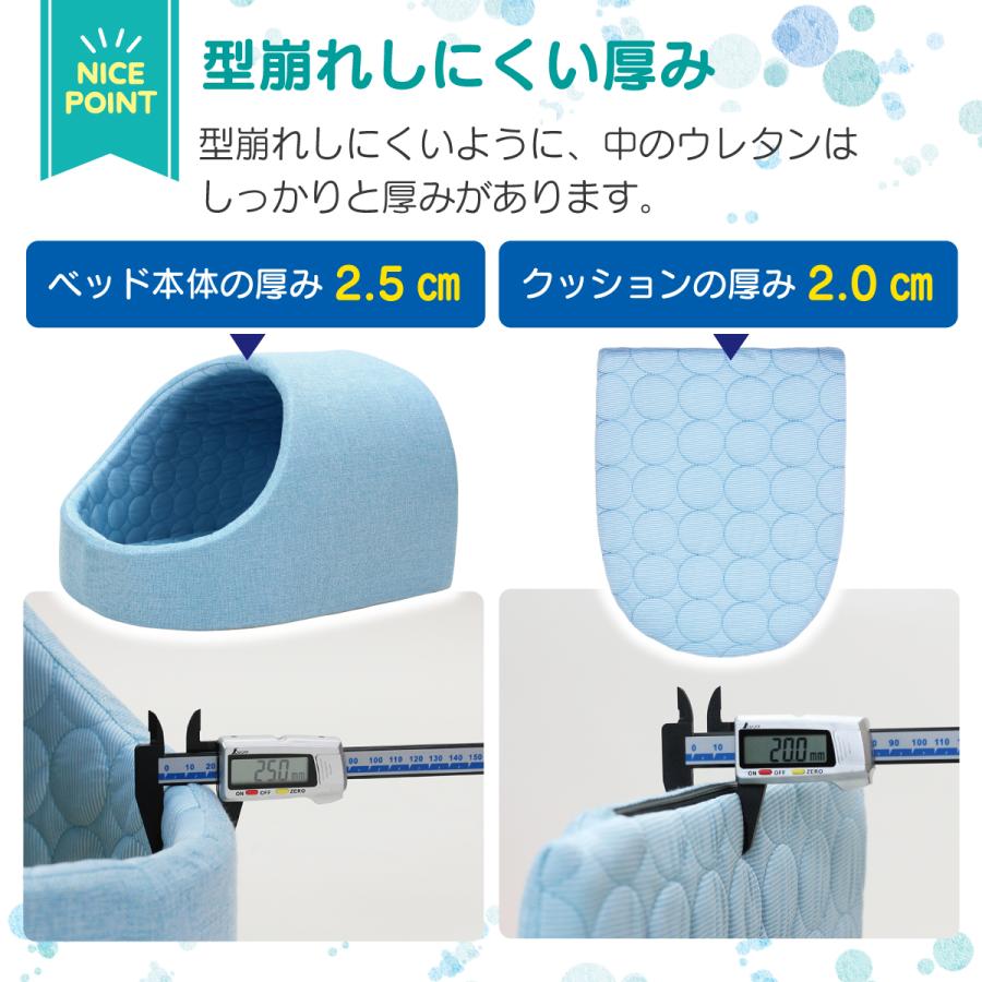 【こわだりの2種類の生地】ベッドの内側はひんやり接触冷感生地、ベッドの外側は通気性の良い麻生地を採用。接触冷感とは触れた部分がひんやりと感じる生地なっています。触れた部分の熱が生地に奪われ、冷たく感じるという仕組みになっています。