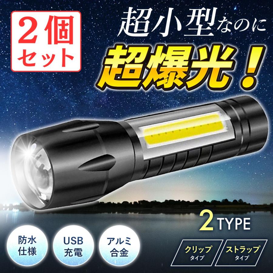 懐中電灯 led 強力 ハンディライト 充電式 COB コードレス 明るい USB 小型 非常用 アウトドア スポーツ アルミニウム合金 アルミ合金 2個セット