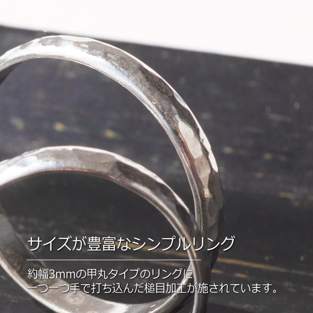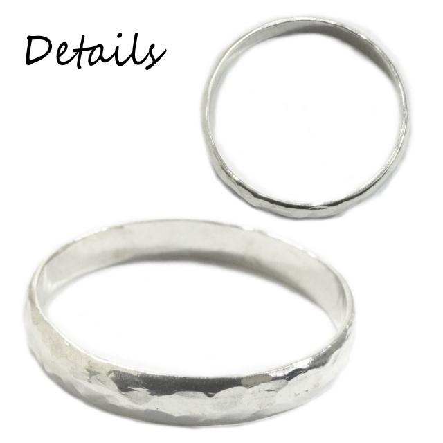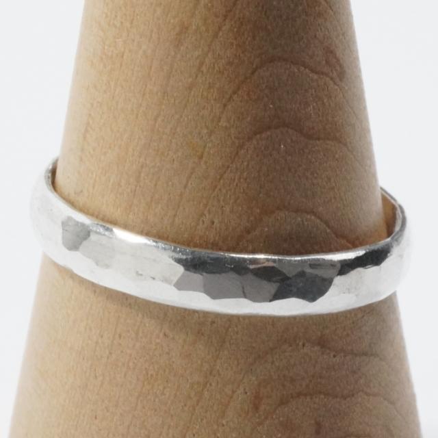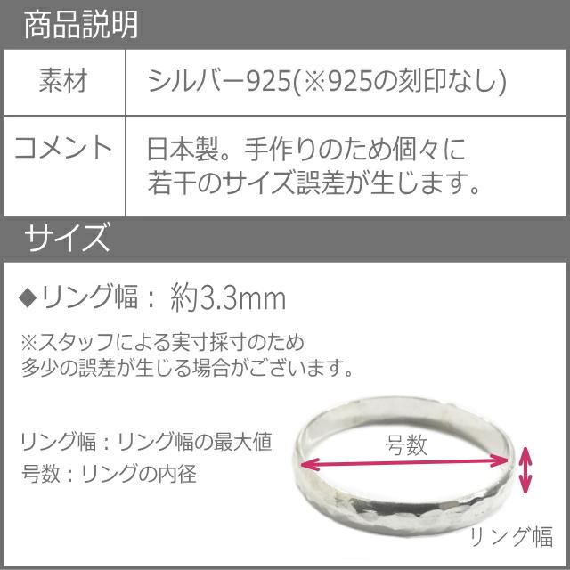 特徴:日本で日本の職人が一つ一つ手作りで作ったシルバー925製の指輪です。925の刻印はございませんので、ご理解の上ご購入をお願いいたします。一つ一つハンマリングして槌目加工しているため、1つ1つ若干のサイズ違いや模様の出方の違いがございます。個性がございますので、ご了承ください。細身で合わせやすいリングです。1号から30号まで幅広くサイズ展開いたしました。1〜7号サイズはピンキーリングやファランジリングにオススメ、大きなサイズは親指につけてもかっこいいです。
