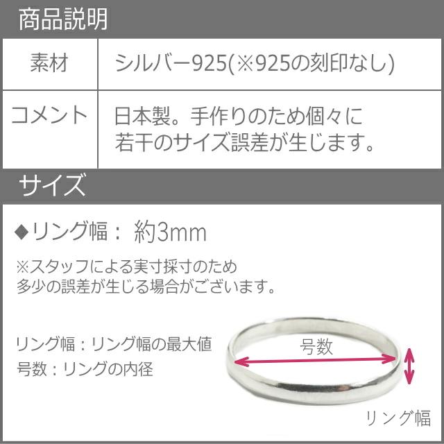特徴:日本で日本の職人が一つ一つ手作りで作ったシルバー925製の指輪です。925の刻印はございませんので、ご理解の上ご購入をお願いいたします。シンプルな甲丸タイプです。細身で合わせやすいリングです。1号から30号まで幅広くサイズ展開いたしました。1〜7号サイズはピンキーリングやファランジリングにオススメ、大きなサイズは親指につけてもかっこいいです。
