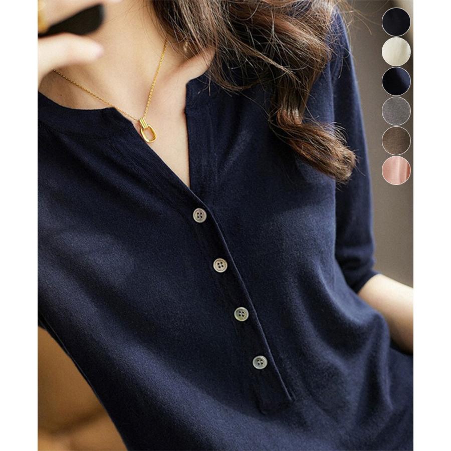 レディース ハーフボタン ニットカットソー 5分袖 薄手プルオーバー 大人可愛い 無地春秋夏トップス 半袖 着やせニット