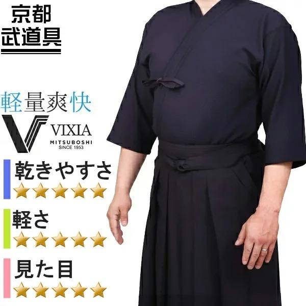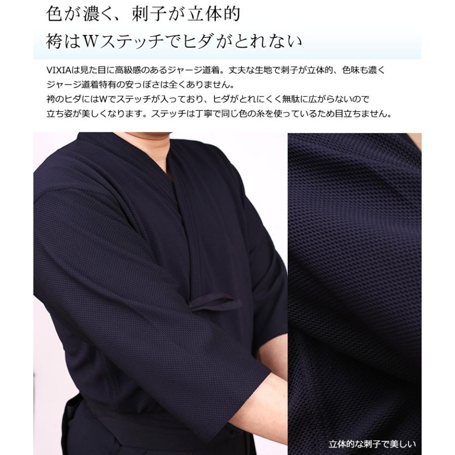 VIXIA(ヴィクシア)ジャージ剣道着は軽量で伸縮性が高いので、とても体を動かしやすい剣道着です。この道着に使用されているHiCoolという素材は、吸汗能力が高く、水分を外へ出す機能があるため、肌面がベタつかず快適な状態を保ちます。通気性も高いので夏場の稽古でも力を発揮します。VIXIA剣道着は色が濃く、刺子が立体的なので、高級感のある見た目に仕上がっています。ジャージ道着ではめずらしい背継仕立で動きやすく立ち姿も美しくなります。