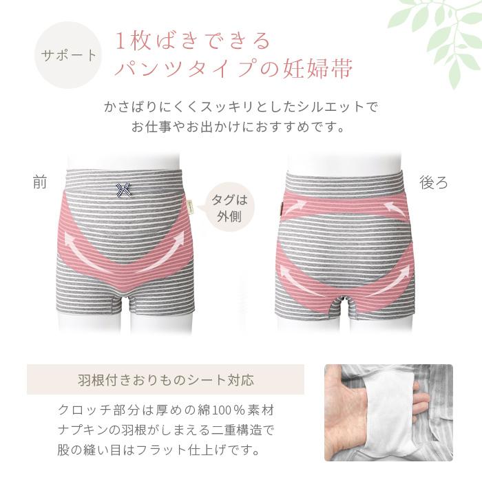 特徴:1枚履きできるパンツタイプの 犬印 らくばきパンツ妊婦帯です。