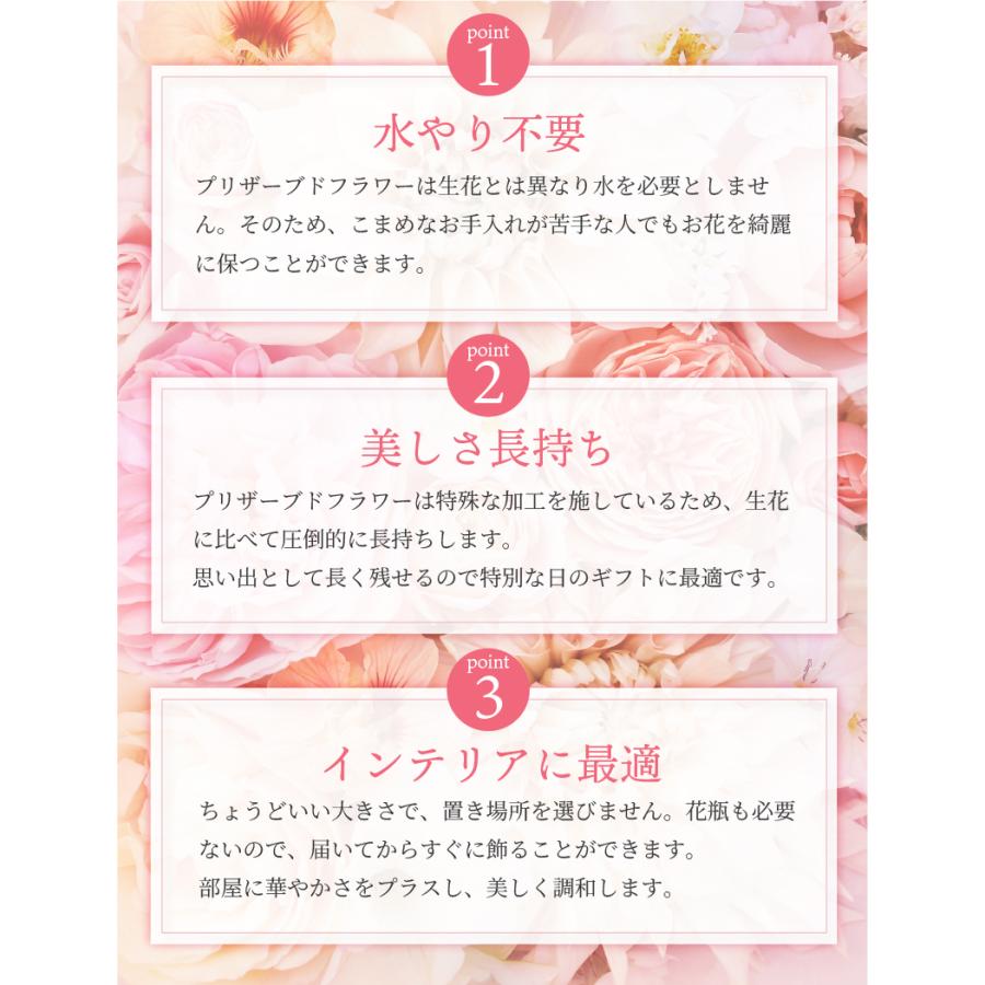 プリザーブドフラワーとは生花に特殊加工を施し、花本来の風合い・みずみずしさを長時間保ち、ご鑑賞いただけるよう開発されたものです。