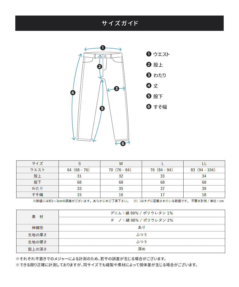 [素材]:デニム:綿80% ポリエステル19% ポリウレタン1% / チノ:綿98% ポリウレタン2%