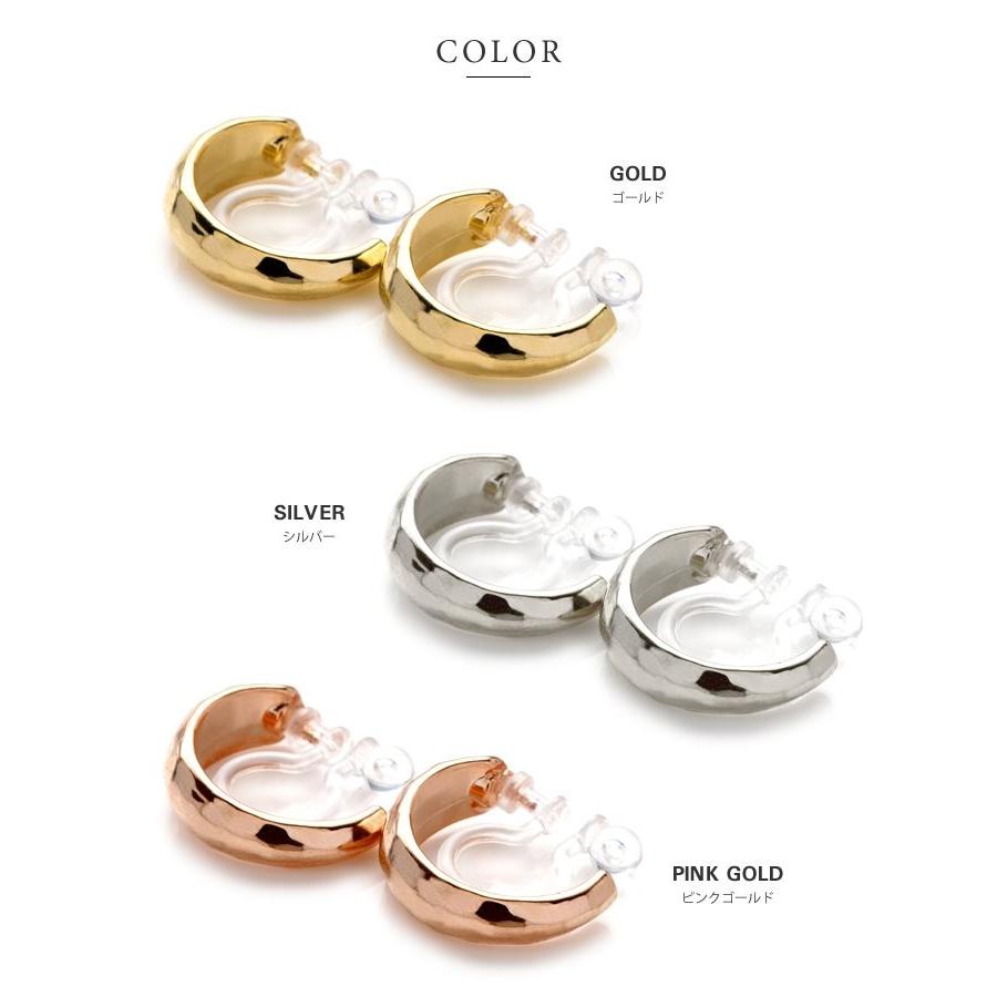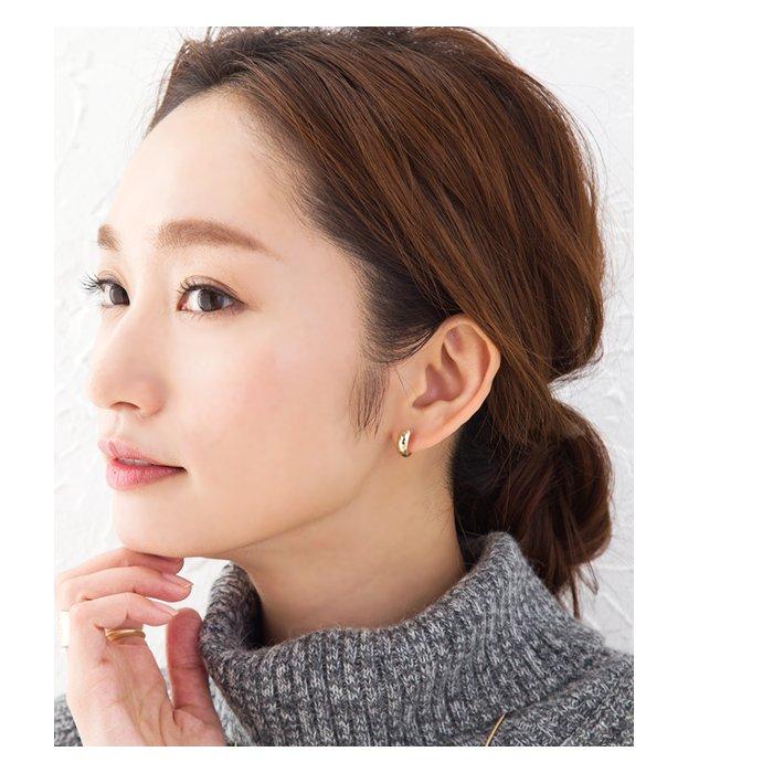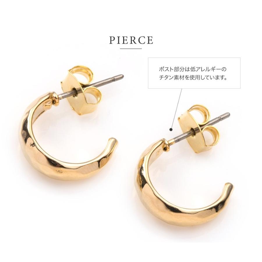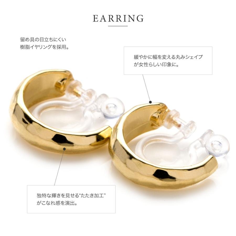 表面にたたき加工を施した小ぶりのフープイヤリング/ピアス。緩やかに幅の変わる丸みシェイプが女性らしい印象で、さりげなくお顔周りを大人華やかに演出。シンプルなフォルムだからオフィス使いにもおすすめ◎