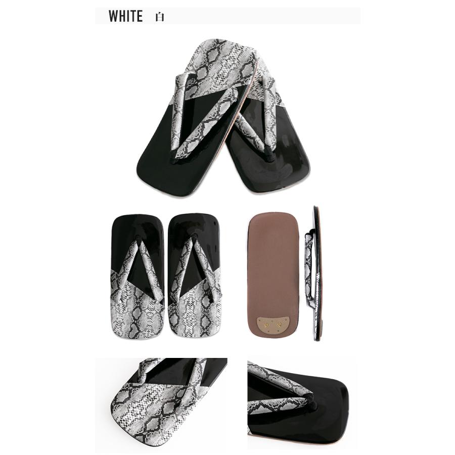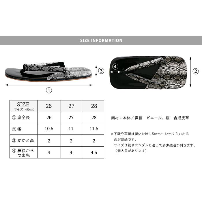 蛇柄とエナメルの生地でデザインされた男性用のお洒落雪駄です。モノトーンでまとめられているので、程良くワイルドな大人の雰囲気に仕上がっています。和服に、浴衣に、普段着に。ぜひ、お手持ちのアイテムに加えて大人のお洒落をお楽しみください。