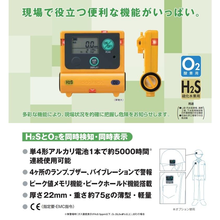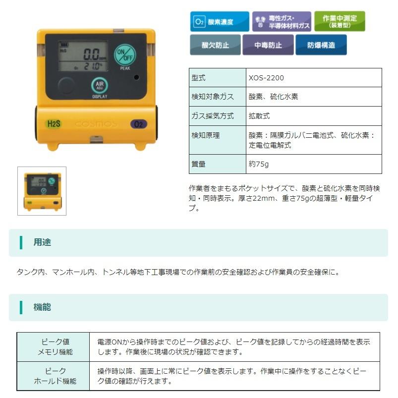 酸素と硫化水素を同時検知・同時表示厚さ22mm、重さ75gの超薄型・軽量タイプ検知対象ガス:素、硫化水素ガス採気方式:拡散式検知原理酸素:隔膜ガルバニ電池式硫化水素:定電位電解式質量:約75gタンク内、マンホール内、トンネル等地下工事現場での作業前の安全確認および作業員の安全確保に標準付属品単4形アルカリ乾電池1本安全ピンアダプタ1個(取付ねじ付)安全対策/工場/危険作業/新コスモス電機株式会社