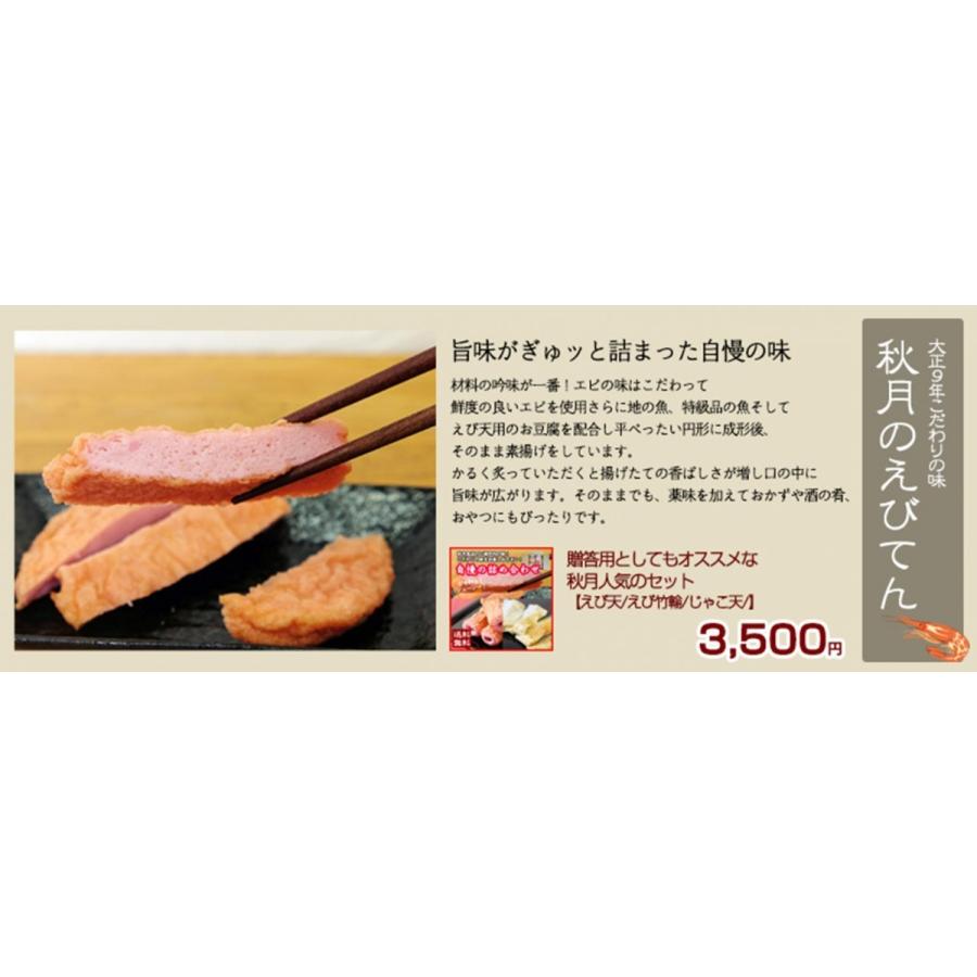 御中元やお歳暮、お土産に是非お選びください。★内容量:秋月のえび天 5枚入り 3袋 70g×15枚 えび竹輪 2本入り 1袋 75g×2本 じゃこ天 4枚入り 1袋 55g×4枚★賞味期限:5日間★熨斗・包装が必要な場合は備考欄にご記入ください。★保存方法:要冷蔵10℃以下