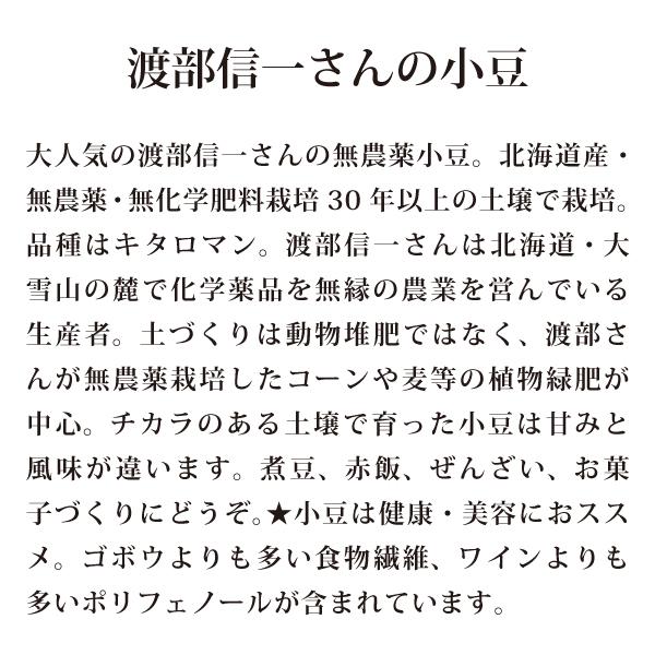 渡部信一さんの無農薬栽培小豆 [正規品]。品種はキタロマン(固定種)。化学肥料不使用・植物堆肥栽培50年以上の土壌で収獲した小豆。渡部信一さんは北海道・大雪山の麓で化学薬品とは無縁の農業を営んでいる生産者。土づくりは動物堆肥ではなく渡部さんが無農薬栽培したコーンや麦等の植物緑肥が中心。チカラのある土壌で育った小豆は甘みと風味が違います。煮豆、赤飯、ぜんざい、お菓子づくり、小豆茶でお召し上がりください。●小豆は健康・美容におススメの豆。ゴボウよりも多い食物繊維、ワインよりも多いポリフェノールが含まれています。●毎年11月下旬−12月上旬頃に「新豆」に入れ替わります。●沖縄県・離島への直送はしておりません。5kg×4セット」でご注文ください。