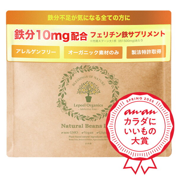 | <!--お召し上がり方--><!--原材料名-->| 原材料名・原産地 | アガベイヌリン えんどう豆抽出物(まめ鉄) レモン果皮抽出物(レピールF葉酸)<!--原材料名--><!--栄養成分および含有量-->| 栄養成分および含有量 | ■栄養成分および含有量 付属スプーン1杯(約1500mg)あたり エネルギー:5.6kcal たんぱく質:0.09g 脂質:0.02g 炭水化物:1.26g 食塩相当量:0.027g 鉄:10mg<!--栄養成分および含有量--><!--商品解説-->| 商品解説 | 日本人女性の半数が陥っていると言われる「隠れ貧血」をサポートする世界初のフェリチン鉄サプリメント「レピールまめ鉄」が誕生! 従来の鉄サプリとは異なり胃のムカムカや便秘などの副作用を起こしにくい、カラダにやさしい鉄サプリなので、妊婦さんも安心して使用できます。 さらに、原材料はオーガニック素材のみ。品質にこだわる方に選ばれているサプリメントです。<!--商品解説--> | | |