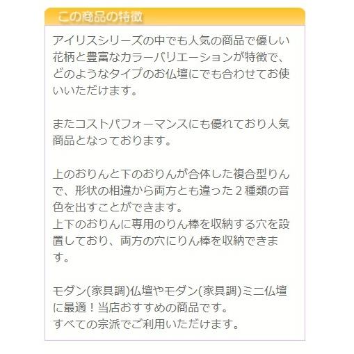 上のおりんと下のおりんが合体した複合型りんで、形状の相違から両方とも違った2種類の音色を出すことができます。