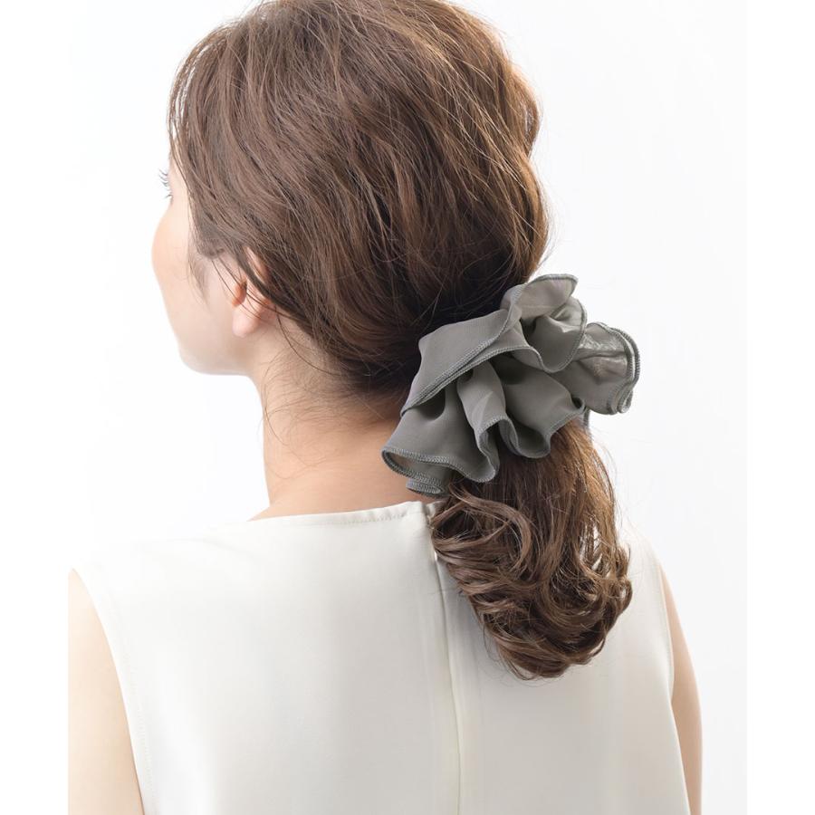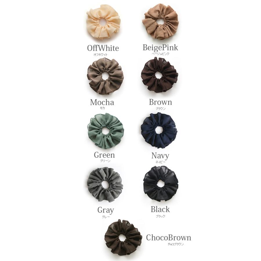 その大きさを感じさせない、軽やかなシフォン生地のシュシュ。結んだ時のフリルのくたっとゆるいシルエットが華やかで可愛い。ゴム周りもしっかりギャザーが施されていて、たっぷりボリュームフリルが完成します。ナチュラルなくすみカラーから定番色まで、幅広いカラーバリエーションなのでスタイルに合わせて楽しめそう♪サイズ▼直径:約17cm素材▼ポリエステル、ゴム 爆買