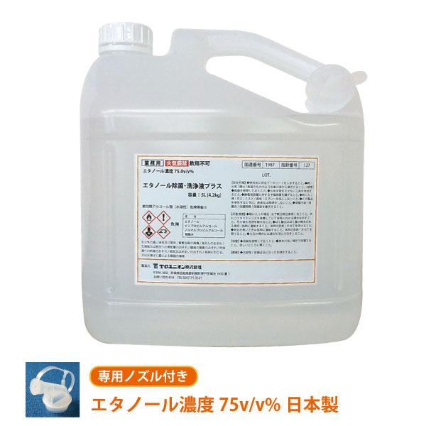【業務用】ウィルス対策・手指消毒使用可 エタノール除菌・洗浄液プラス 5L (4.2kg/エタノール濃度75v/v%)無香料/専用ノズル付 / 日本製