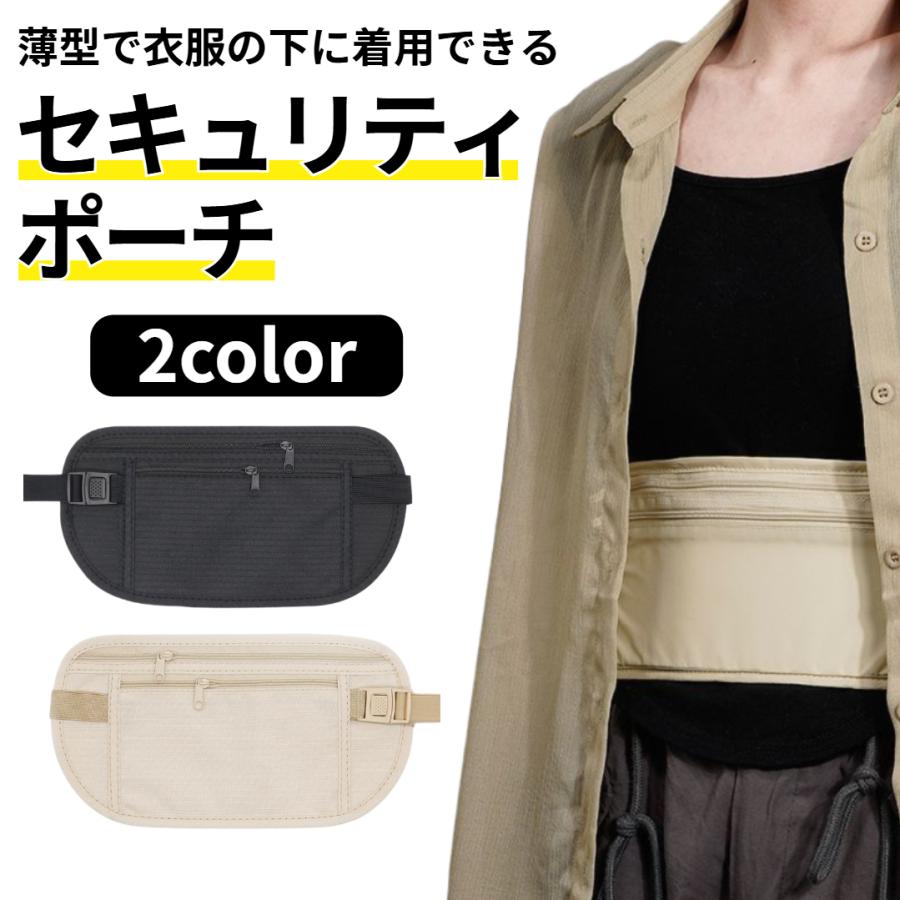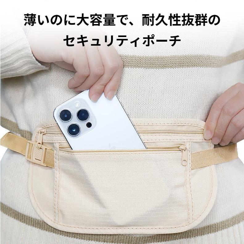 盗難防止用のセキュリティポーチ!軽量で薄型なので衣服の下に着用する事で、貴重品などの盗難を防ぎます。2つのポケットがあり、スマホや財布、パスポート等を収納できます。旅行だけでなく、登山やキャンプ・ウォーキングなど際も使い勝手の良いウエストポーチとしてご使用頂けます。カラー:ブラック・ベージュサイズ:約14cm×25.5cm