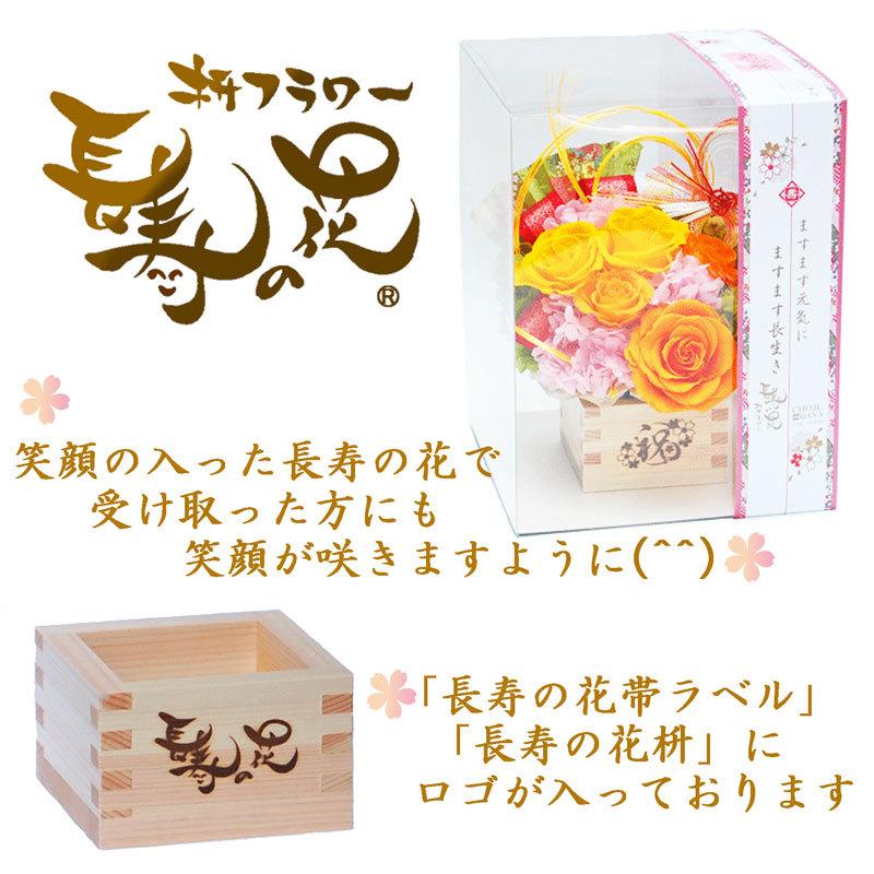 「枡フラワー 長寿の花」は、枡のお花に「ますます元気に」「ますます長生き」の願いを込め、美しく咲き続けるお花「プリザーブドフラワー」に、長寿の願いを込めたお花です。