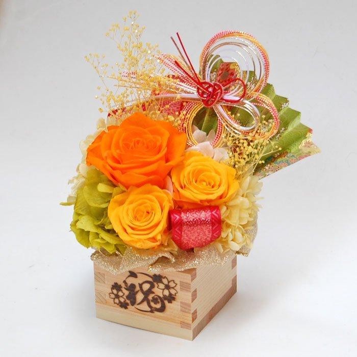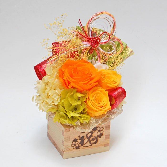 五勺枡の枡フラワー 「綾姫(あやひめ、黄色)」は、黄色やオレンジ色の薔薇(プリザーブドフラワー)が愛らしく咲く枡フラワーです。
