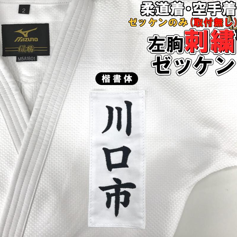 空手着・柔道着 左胸刺繍ゼッケン※こちらの商品は[取り付け無し]の刺繍ゼッケン注文ページとなります。柔道着とご一緒のご注文の場合、取り付けは行いませんのでご理解の程よろしくお願いいたします。団体名や個人名を刺繍した生地にしました。学校販売の柔道着に付けたい人や団体名を直接刺繍したくない方にオススメ!サイズ8×20cmゼッケンは、刺繍加工によるゼッケンです。