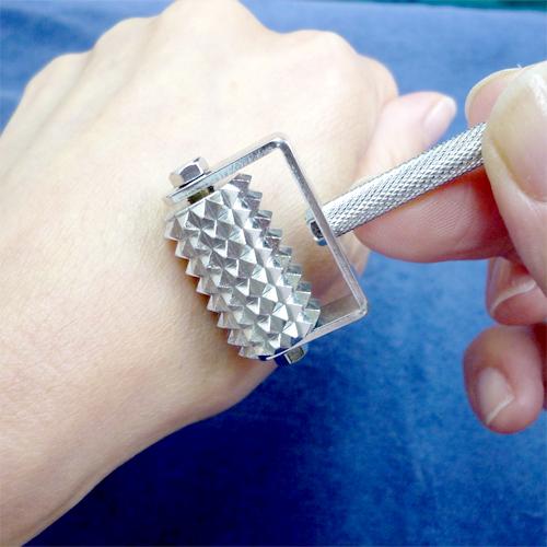 ● ローラー鍼とは接触鍼のひとつで、ギザギザが特徴の鍼。● ギザギザのローラー部分を患部に転がすことにより、刺激を加えます。● 刺さない鍼で、刺激がマイルドなのが特徴の鍼です。● 患部の肌の状態を確認しながら使用するのをお勧めします。