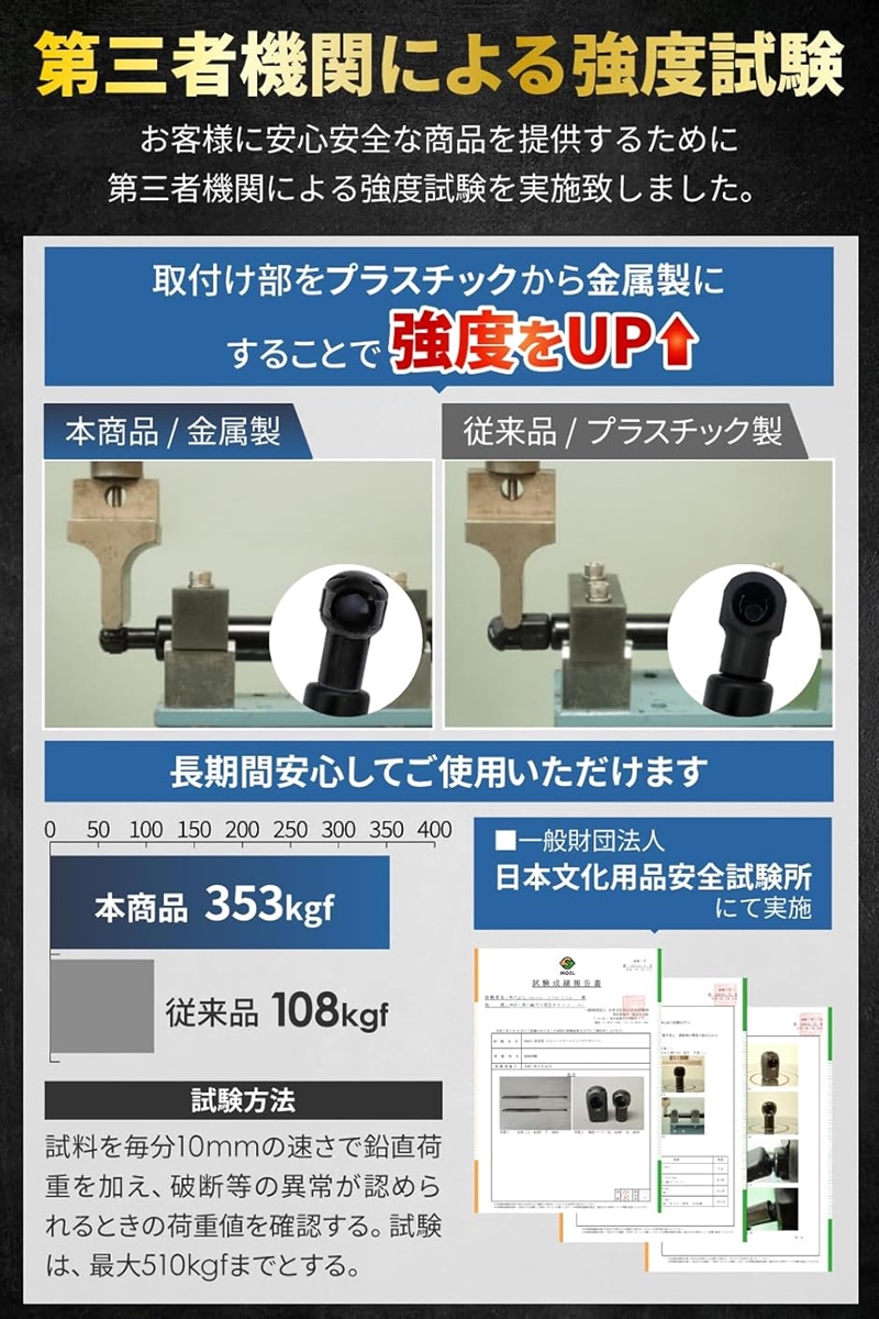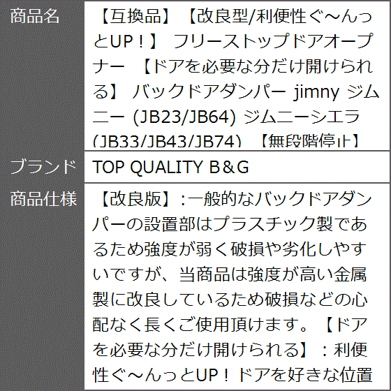 「改良版」:一般的なバックドアダンパーの設置部はプラスチック製であるため強度が弱く破損や劣化しやすいですが、当商品は強度が高い金属製に改良しているため破損などの心配なく長くご使用頂けます。