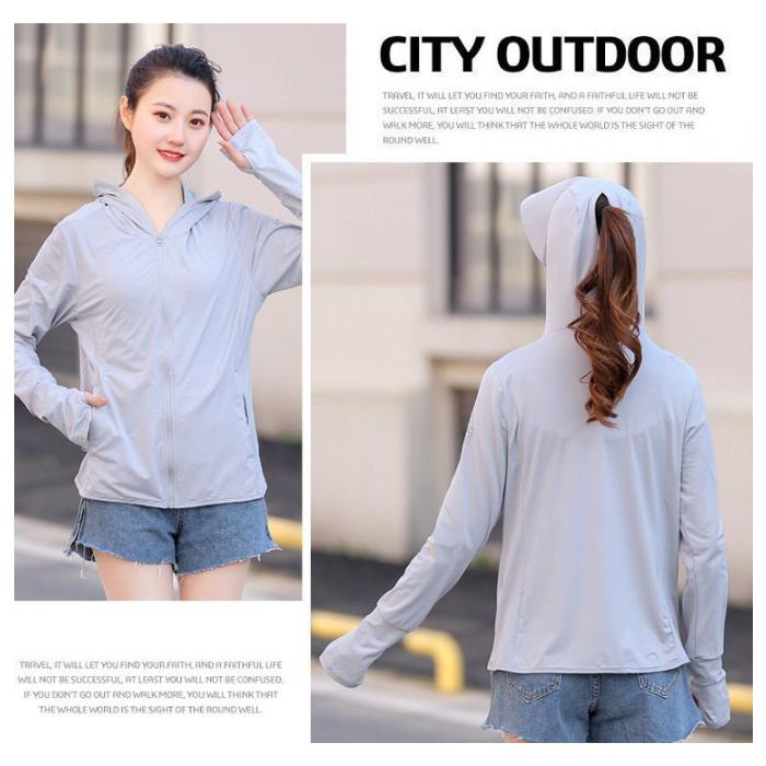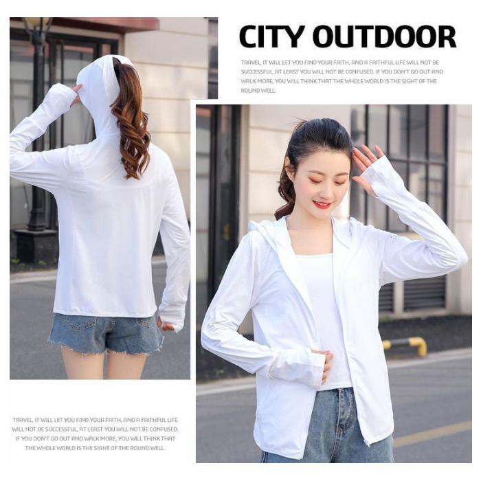 ジッパー を上げると 首まで 日焼け 紫外線対策 できる 日焼け防止 服 日焼け止めパーカー です。