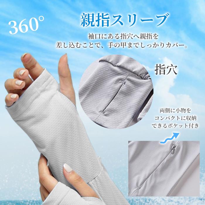 手の甲を覆う指穴もある長袖タイプ でアームカバーいらず。