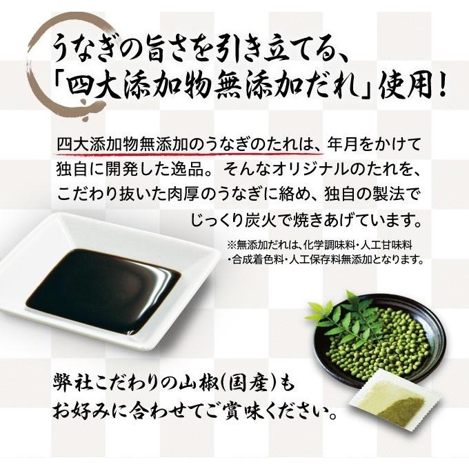 「こだわり3」うなぎの旨みを引き出す四大添加物不使用の「無添加だれ」使用。更にさっぱりした深みを与える味に調整を加え、女性でも食べやすく仕上げました。