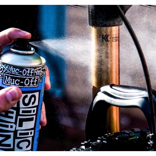 MUC-OFFのシリコンシャインは、あなたのバイクを新品同様に仕上げるスプレーであるとともに、サスペンションの摩擦を軽減します。フォークやリアショックにスプレーすることで抵抗を減らし、シルキーで滑らかな動きを実現します。