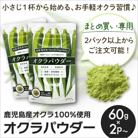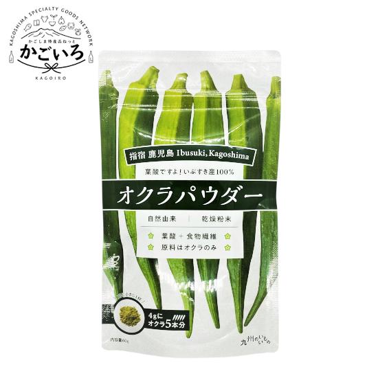 生産量日本一の鹿児島県指宿産オクラ100%使用。水を加えるとオクラの特徴であるネバネバが復活。食物繊維やポリフェノール、妊婦さんに必要な葉酸が豊富に含まれており、小さじ1杯(4g)でオクラ5本分。薄緑〜緑色の粉末。食品添加物、デキストリン不使用。