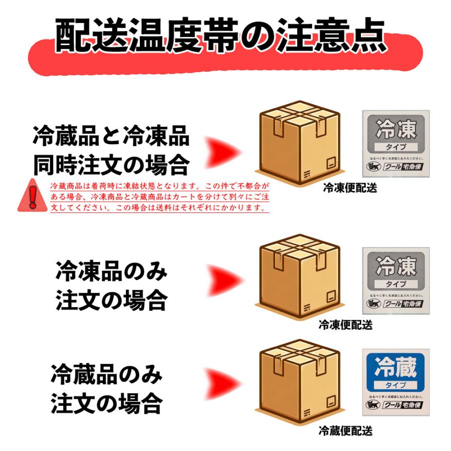冷凍・冷蔵商品を同時にご注文の場合、品質保持の観点から配送は「冷凍」便となります。冷蔵商品は着荷時点で凍結状態となります。この件で不都合がある場合、お客様の方からご連絡をいただきますようお願い申し上げます。