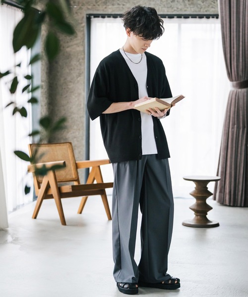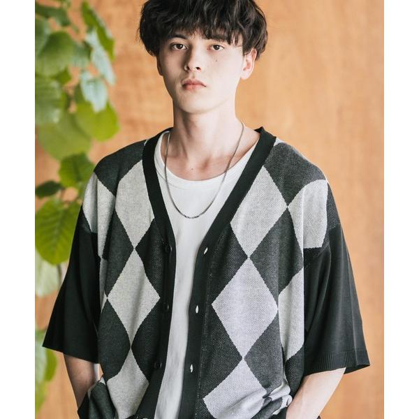 商品名:接触冷感 UVカット オーバーサイズ 無地 アーガイル柄 チェック柄 Vネックハイゲージサマーニット半袖カーディガン