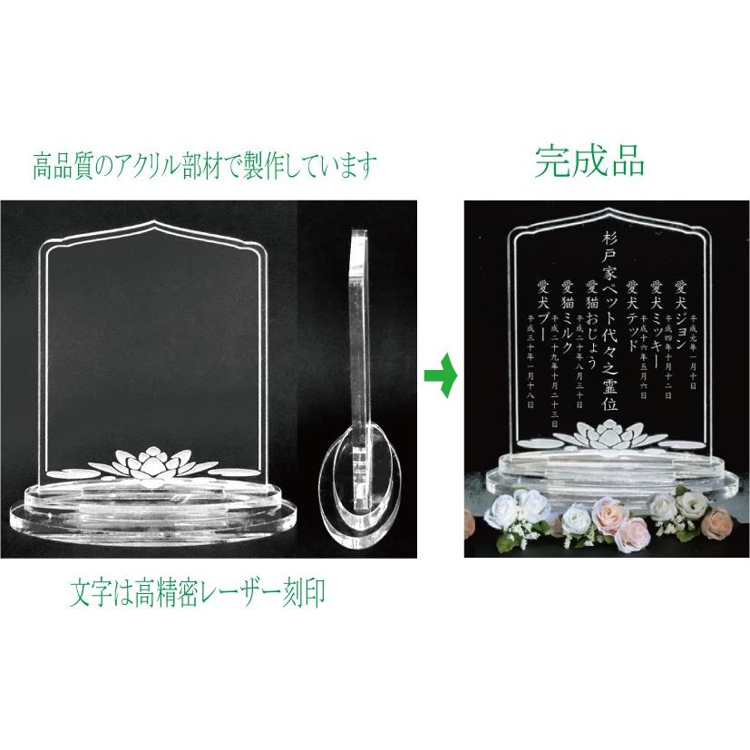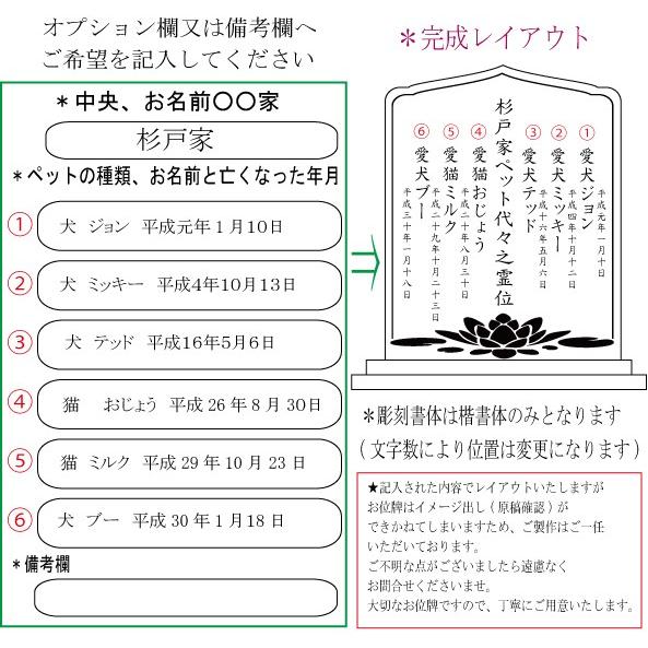 ※商品は本体前面に「愛猫○○之霊位、 愛犬○○之霊位」などの文字を彫刻してお届けとなります。ご注文時に「動物の種類」、「ペットのお名前」(※かな・漢字のみ)、「命日」(※令和六年五月八日など)、オプション欄にご記入ください。なお、縦書きのためお名前はかな・漢字のみ、年月は和暦のみ、彫刻書体は楷書体のみとなります。