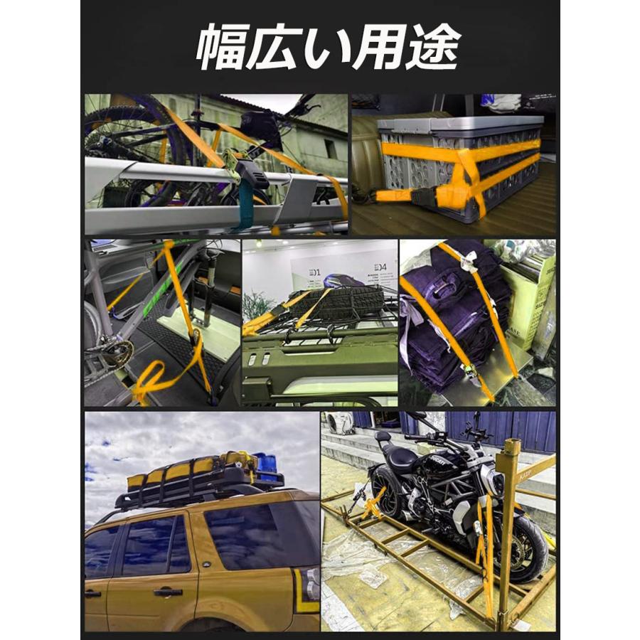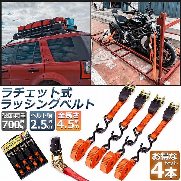 【仕様】ベルト/ポリエステル ラチェットバックル/鋼材 長さ:4.5m 幅: 2.5cm 使用荷重:200kg 破断荷重:700kg【S字フック】Sフックがラバーコーティングされているため、自転車、バイク、サーフボード、ボートなど大切なアイテムを傷つけずに引っ掛けることができます。【ラチェット機能】荷締めベルトはラチェット機能付きで、しっかりと荷物の締め付けが行えます。ポリエステル素材を使用し耐久性は抜群で商品を損なわない