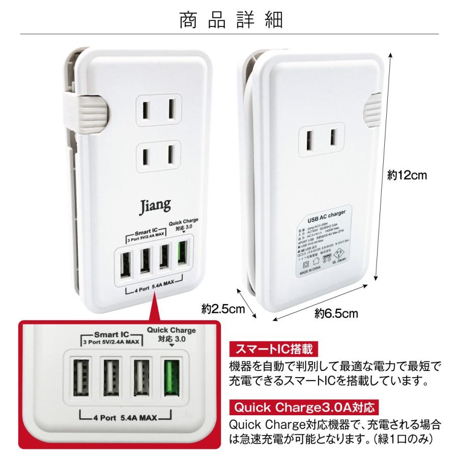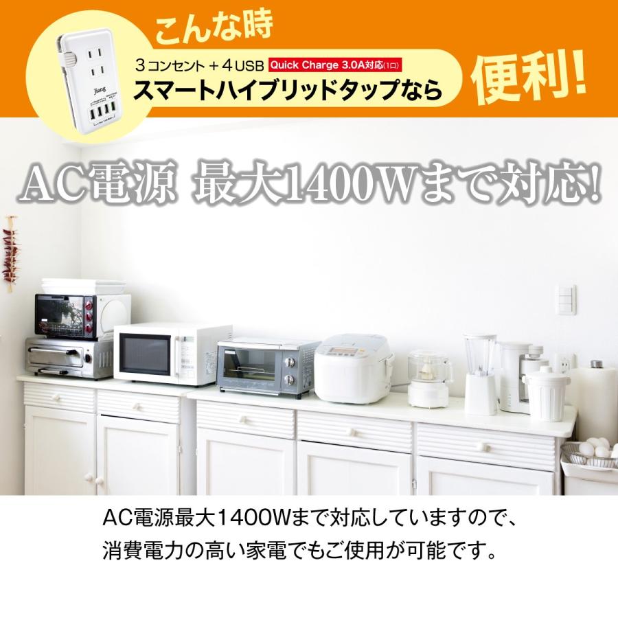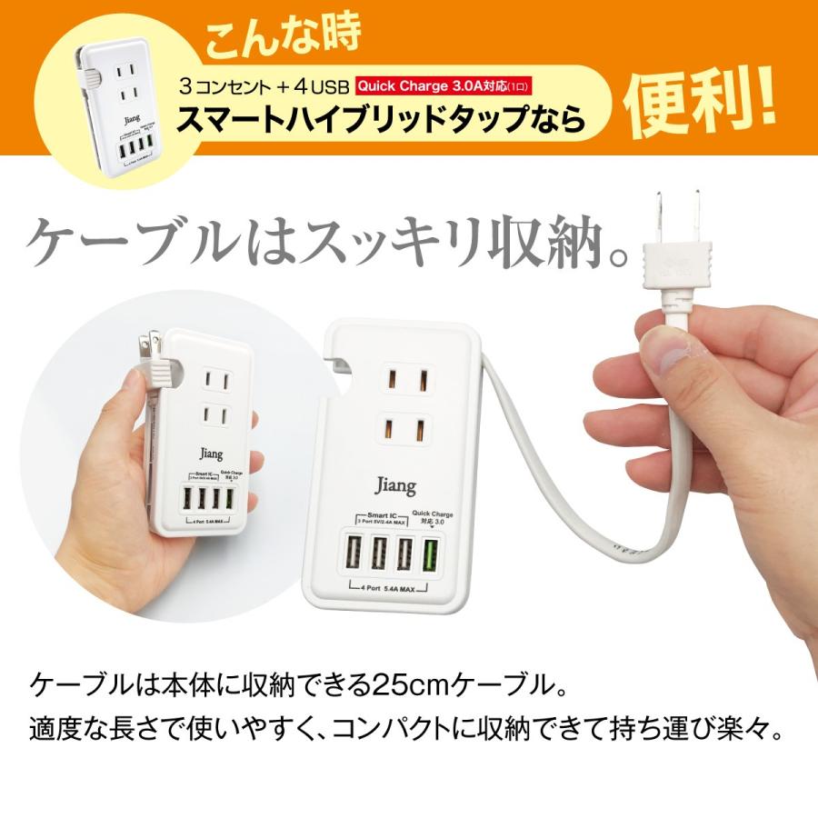 コンセントもUSBもお任せ!USB4ポート&コンセント3口スマートハイブリットタップUSBは最大3.0A出力。合計最大5.4A出力。Quick Charge 3.0A対応(1口)自動判別機能の「Smart IC」を全ポート搭載。コンセントは、最大1400Wまで対応していますので、消費電力の高い家電でもご使用可能です。同時充電可能。本体に収納できる25cmケーブル付きでコンパクトに収納できて持ち運びに便利です。※発送はメール便になります。