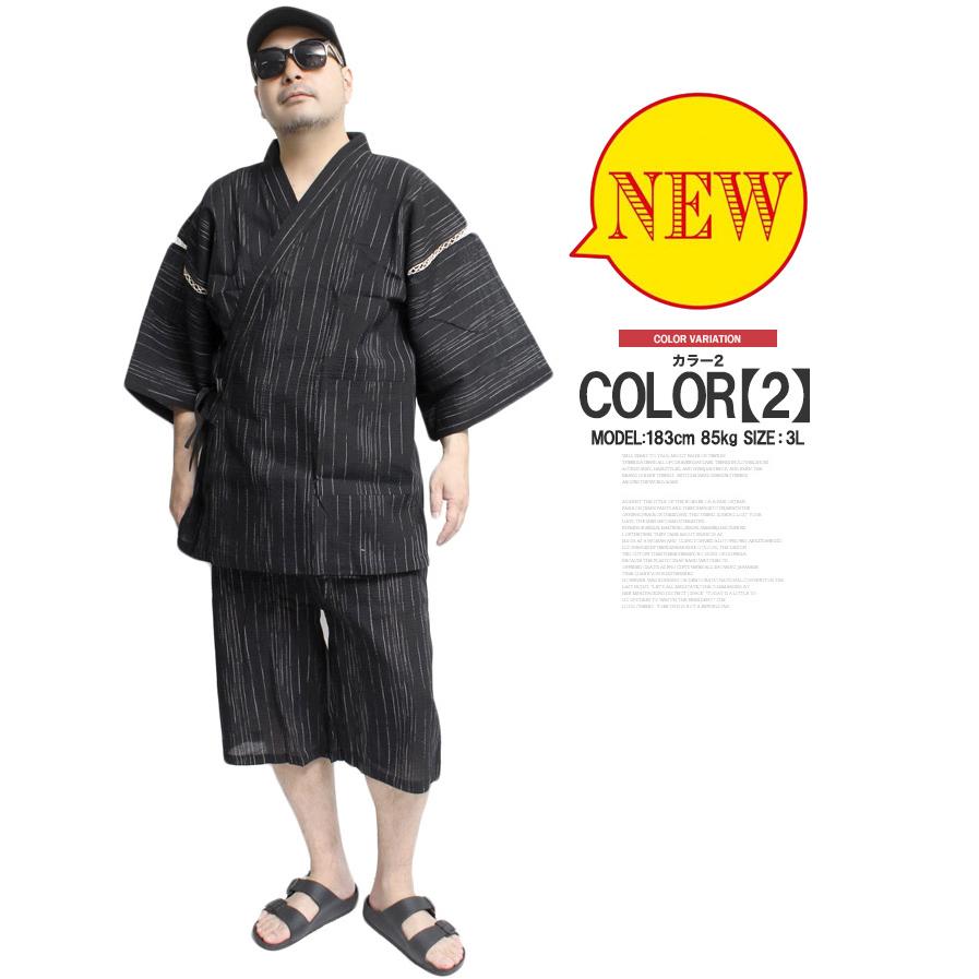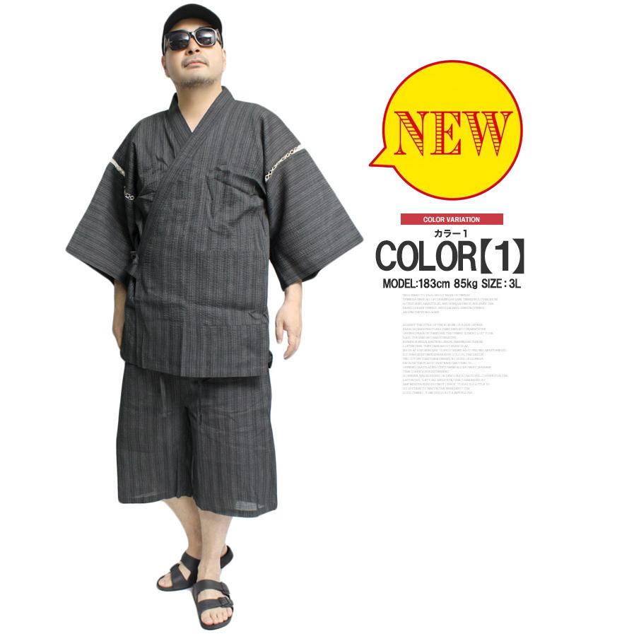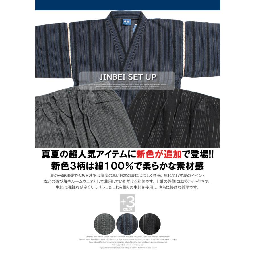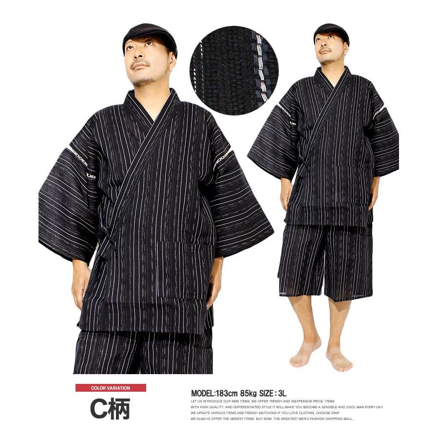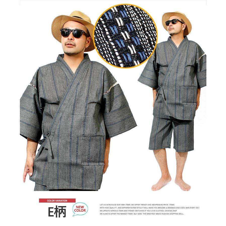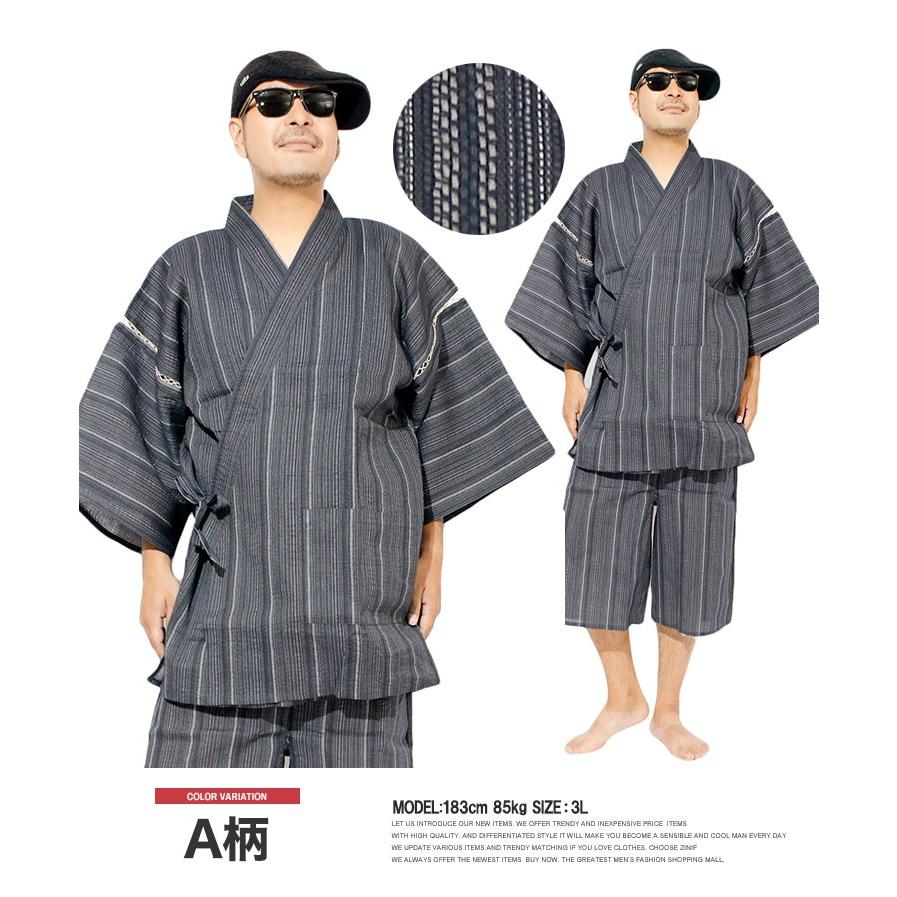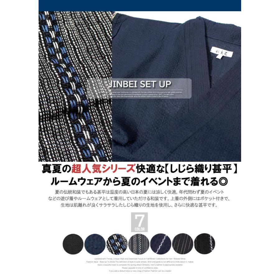 【説明】しじら織り甚平の登場です。夏の伝統和装でもある甚平は湿度の高い日本の夏には涼しく快適。年代問わず夏のイベントなどの遊び着やルームウェアとして着用していただける和装です。上着の外側にはポケット付きで、生地は肌離れが良くサラサラしたしじら織りの生地を使用し、さらに快適な甚平です。サマーシーズンをより快適に、より楽しくお過ごし頂けるオススメのしじら織り縞模様甚平上下セットです。【素材】ポリエステル65% 綿35% やや透け感あり