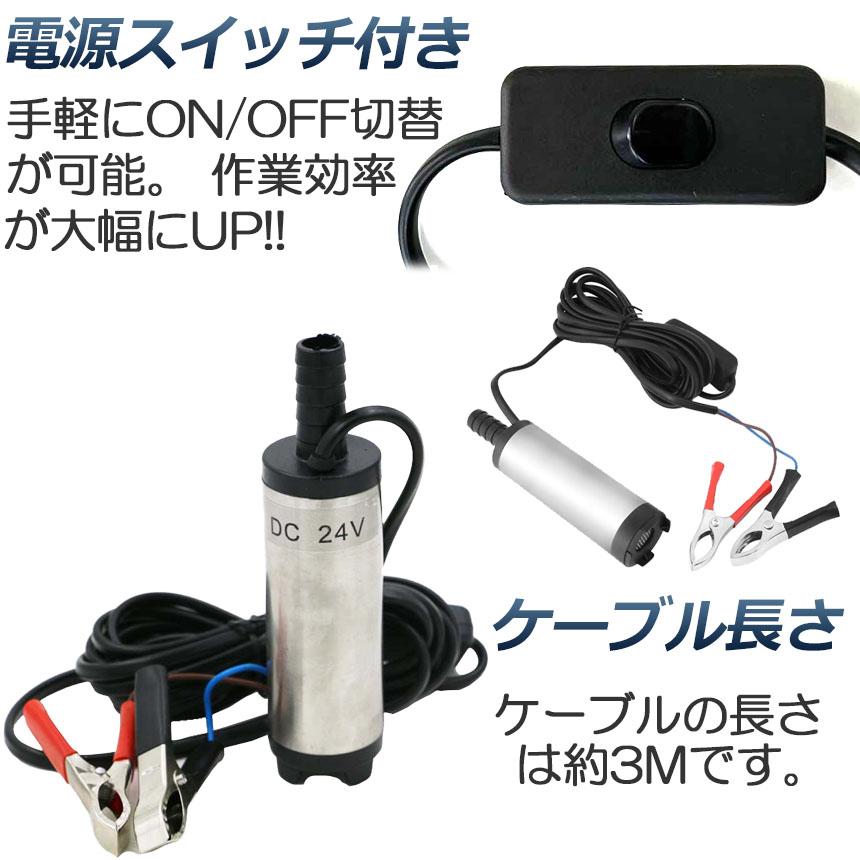 【商品仕様】:ON/OFFスイッチ付き 高さ:約16cm ポンプ直径:約38mm 吐出口径:約16mm ケーブル全長:約3m 吐出量:約12L/min 揚程:2m 電圧:DC12V&24V 電流:1.5A 接続方式:クランプ(ワニ口クリップ) 材質:ステンレス 適用範囲:ディーゼル、水、灯油、オイル等